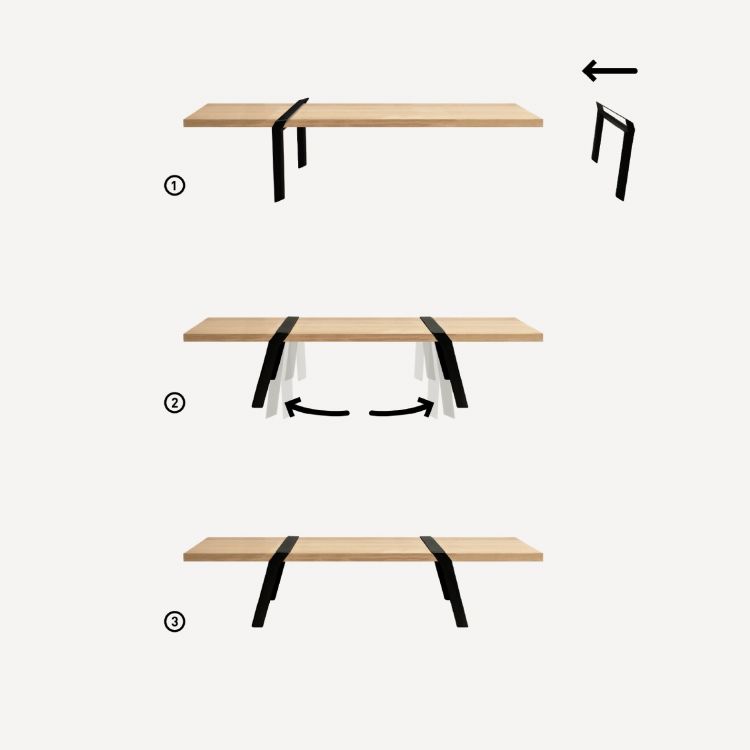 Legs designed for a 600 mm wide and 40 mm thick top. Recommended length of the table top : 1,50 m to 2,60 m depending on the material.